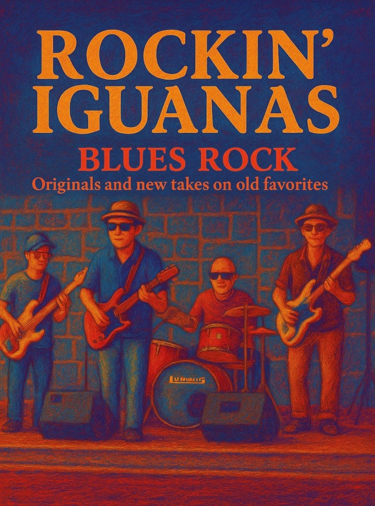 Here are the Rockin’ Iguanas doing our best to keep it going. Special thanks to Andy Whittet filling in on drums while John G. gets back on his feet. John said the show must go on, and so it did!